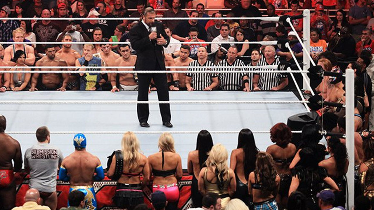 Hilariante de pensar que já trabalharam um angle em que Triple H transmitiu a Vince que estava despedido e tomava o seu lugar. E que, apesar de ser babyface e ter o apoio do público, eram os empregados que estavam descontentes com ele. E abandonaram-no. Todos. Lutadores, comentadores, árbitros, operados de câmara, tudo. Triple H ficou sozinho no ringue. Que é o primeiro ponto hilariante. Que estava ali mesmo o futuro chefe e bem recebido nisso. O segundo ponto hilariante é a fonte da insatisfação. Insegurança. Havia terror por parte dos lutadores pelo caos no backstage. Já isso é engraçado, pensar que lutadores se sentem inseguros quando andam sempre ali à bulha com outros. Mas tem mais graça ainda pensar quem eram os que destabilizavam mais. Muito tarde para serem os Nexus, muito cedo para serem os Shield, certamente não eram os Wyatt Sicks. Eram os Awesome Truth. Equipa fantástica, mas há que realçar que todo o plantel votou “não confiança” a Triple H porque estavam com medo do Miz e do R-Truth.
