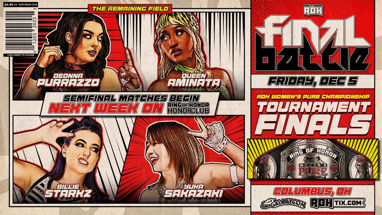 Nas últimas semanas tem estado a decorrer um torneio para encontrar a primeira campeã do novo ROH Women’s Pure Championship. A grande final do torneio irá acontecer no Final Battle. Quem será a primeira campeã?