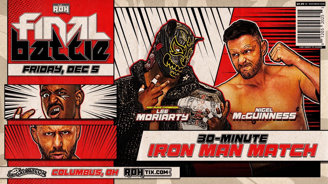 Depois de um recente Proving Ground Match ter terminado em empate por tempo limite, Lee Moriarty ia defender o ROH Pure Championship contra Komander no Final Battle, mas este vai afinal lutar pelo título mundial. Por sua vez, Nigel McGuinness desafiou o campeão para um 30-Minute Iron Man Match. Irá o título mudar de mãos?