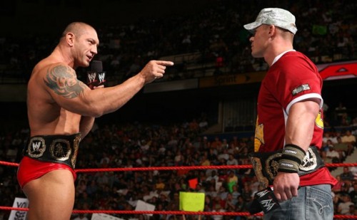 John Cena conquistou: World Heavyweight Championship (2x), World Tag Team Championship (2x) – com Shawn Mich.aels (1) e Batista (1), WWE Championship (10x), WWE Tag Team Championship (2x) – com David Otunga (1), e The Miz (1), WWE United States Championship (3x), Raw Money in the Bank (2012), Royal Rumble (2008), Slammy Award winner – 2009 e 2010 Superstar of the Year, Slammy Award for Holy $#!+ Move of the Year (2010) Sends Batista through the stage with an Attitude Adjustment, Slammy Award for Game Changer of the Year (2011) – com The Rock, PWI Feud of the Year (2006) vs. Edge, PWI Feud of the Year (2011) vs. CM Punk, PWI Match of the Year (2007) vs. Shawn Michaels no Raw, April 23, PWI Match of the Year (2011) vs. CM Punk at Money in the Bank, PWI Most Improved Wrestler of the Year (2003), PWI Most Popular Wrestler of the Year (2004, 2005, 2007) e PWI Wrestler of the Year (2006, 2007). Batista – 3 Cena – 5